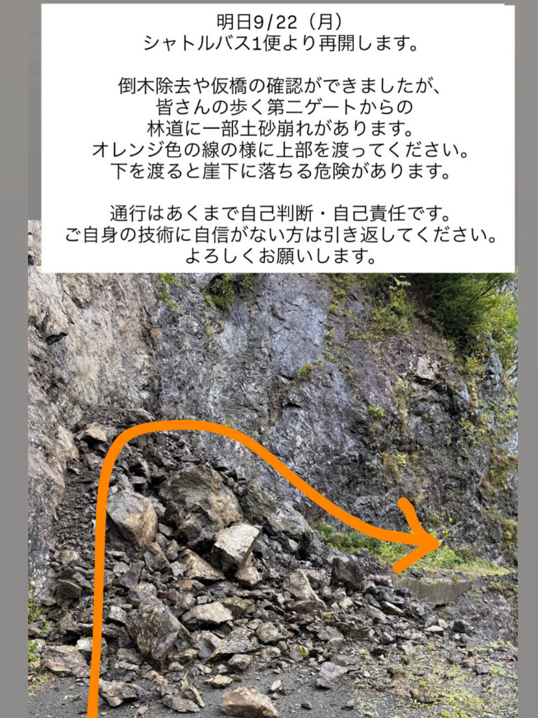 明日9/24(水)土砂崩れの補修のため重機が入ります。お越しの方は気をつけて歩行してください。